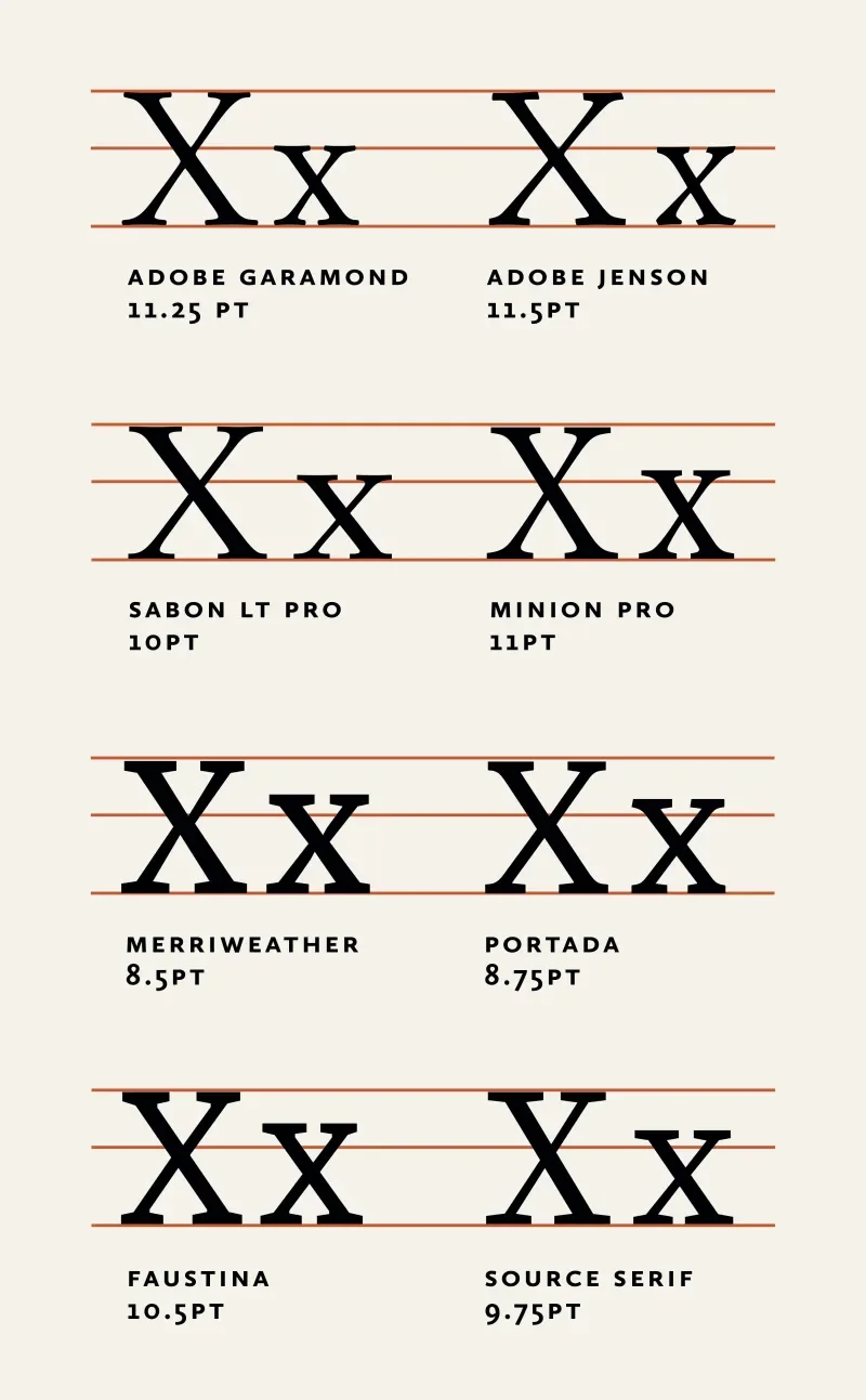 The typefaces with larger x-heights and thicker more sturdy appearance will be more suitable to scale down further to save additional pages. The x-height of the font is how tall the lowercase x is. You can see how some fonts, even when at equivalent sizes have a higher x-height. This makes them more readable at smaller scales. If a font has an x-height that is far too high or too low, it will be hard to read at small sizes.