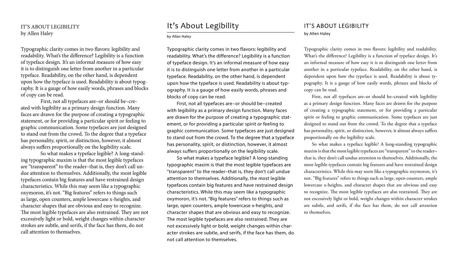 Have you ever read a book that makes your eyes tired? it may be because the lines of text or even the letters are too close together and need more breathing room. Alternatively, lines that are too far apart may take longer to digest. Do certain words take longer to read? Maybe the 'x' height of the chosen typeface is too tall, making it harder to distinguish letters. If you really want to get down to the details, there may be a couple of letters that feel too close that should be moved apart manually.